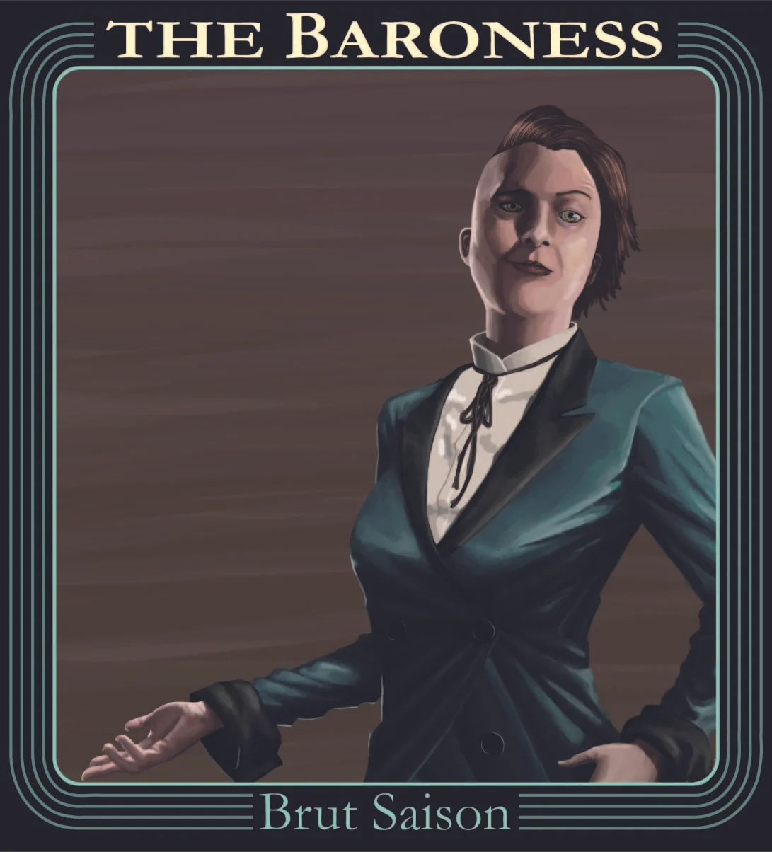 The Baroness is a tart, dry, effervescent, tribute to our favorite sorceress, Collete Dubois. It features flavors and aromas of elderflower, apricot, and zesty citrus. 5% alc/vol.